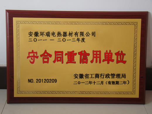 如今,安徽環瑞贏來了又一重要的企業榮譽“安徽省守合同重信用企業”,對于包括公司內部合同管理機構,制度,100%合同履行率等其他公司信用的評定。這也是近來電伴熱工程招標中,所看重的產品資質。