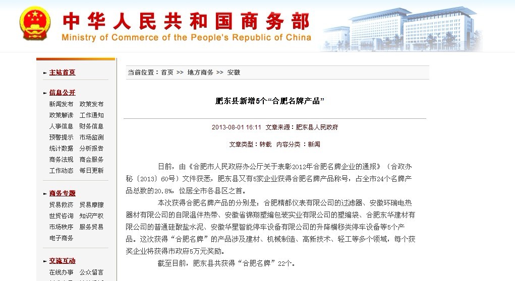 熱烈祝賀環瑞憑借自限溫電伴熱榮獲合肥名牌產品榮譽稱號,以下為中華人民共和國商務部轉載新聞,內容如下: